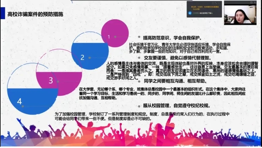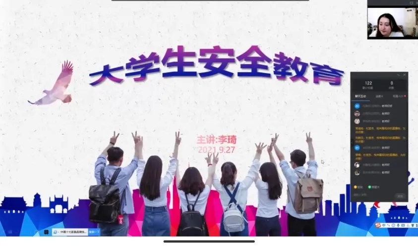 为提高必赢官网学生的安全防范意识和依法维权意识,让同学们学会自我保护,预防安全事故的发生。9月27日,必赢官网开展“大学生安全教育”线上主题宣讲活动,此次活动由辅导员李琦主讲,全体21级新生参加。
