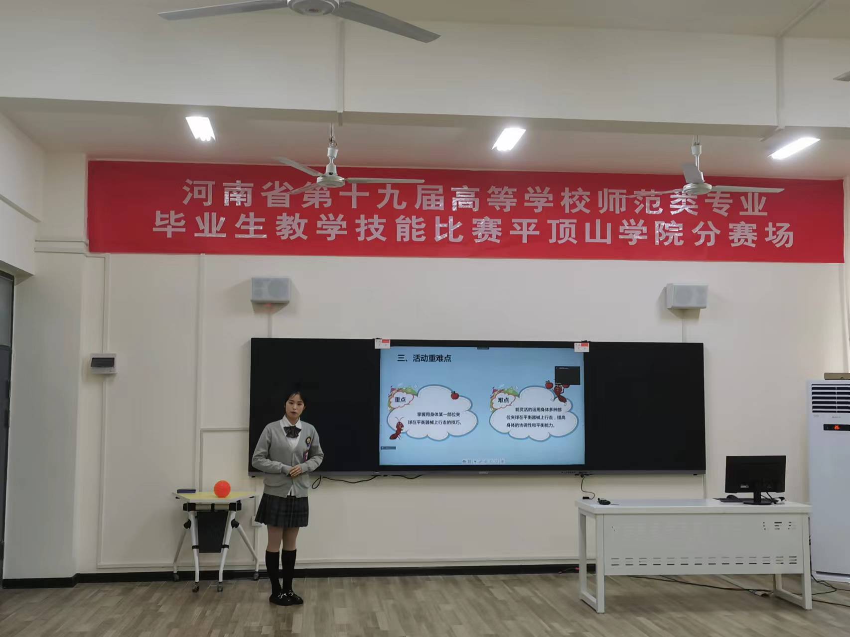 比赛按照河南省教育厅第十九届高等学校师范类专业毕业生教学技能比赛通知要求,严格落实全省教育系统疫情防控工作会议精神和学校疫情防控工作要求,采用线上线下结合的方式开展。比赛过程中两位同学利用多媒体和教学工具对自己所抽到的课题进行说课、答辩、才艺展示,在注重理论阐述的同时兼顾互动环节,使得教学内容丰富多彩,教学过程生动活泼,充分体现了我校师范生良好的精神风貌。