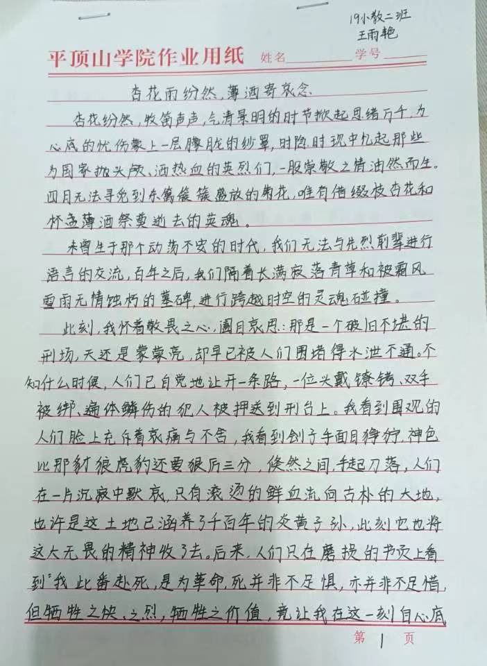 此次活动形式丰富多样,同学们通过短视频制作、办手抄报,写文章的方式踊跃参与这次活动。同学们在参与活动的过程中,深刻的了解了清明习俗,学习了革命先烈的光辉历史,同时也更加明白了革命英雄精神与中国特色社会主义的深刻内涵。通过这一主题活动,同学们深感作为新世纪的⼀代⼈,我们要发愤学习,更要懂得幸福⽣活的来之不易,明确我们所肩负的历史责任和历史使命,尽⾃⼰所能地献出我们薄弱的⼒量。