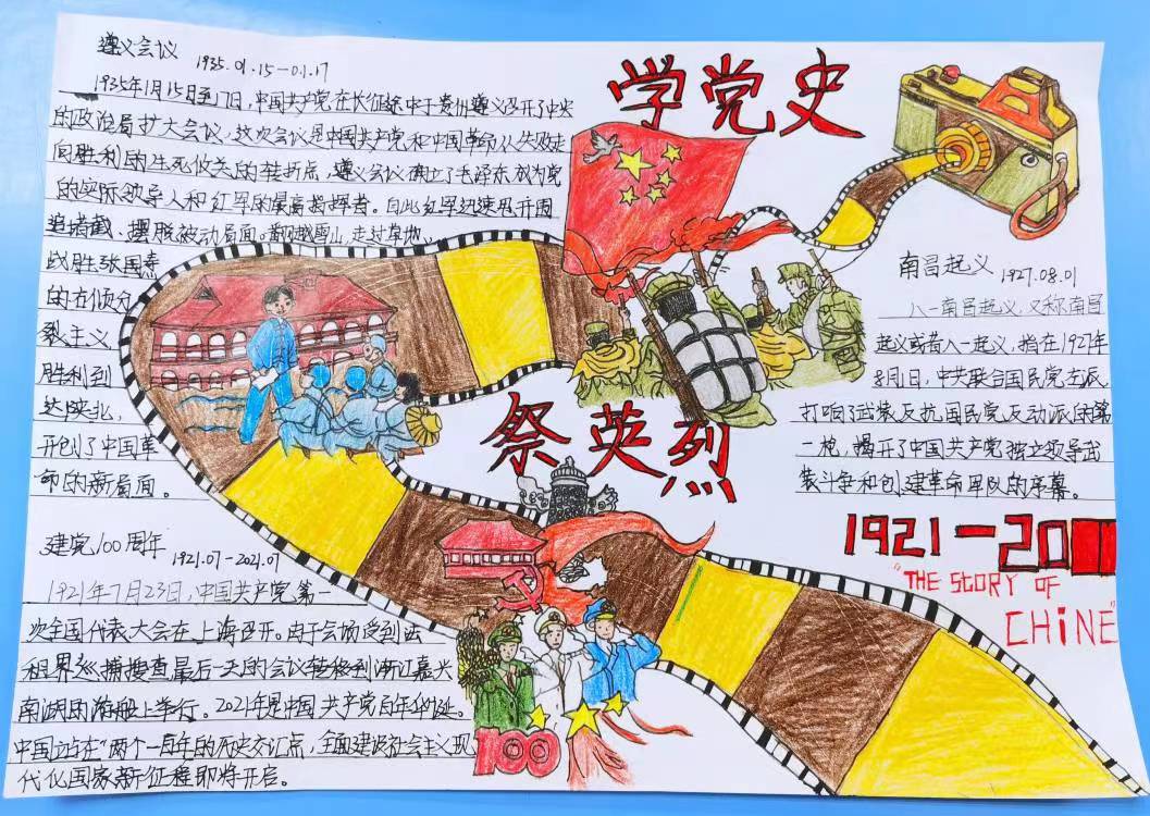 同学们以红色党史故事为主题,回顾党成立以来各个伟大时期的革命先烈,细心的用画笔描绘出每一个精彩瞬间,列举自己心中的革命英雄,将我们对先烈们的怀念与敬仰之情倾注于作品之间中。作品虽然简单,但是对党和国家的爱却明亮又炙热。