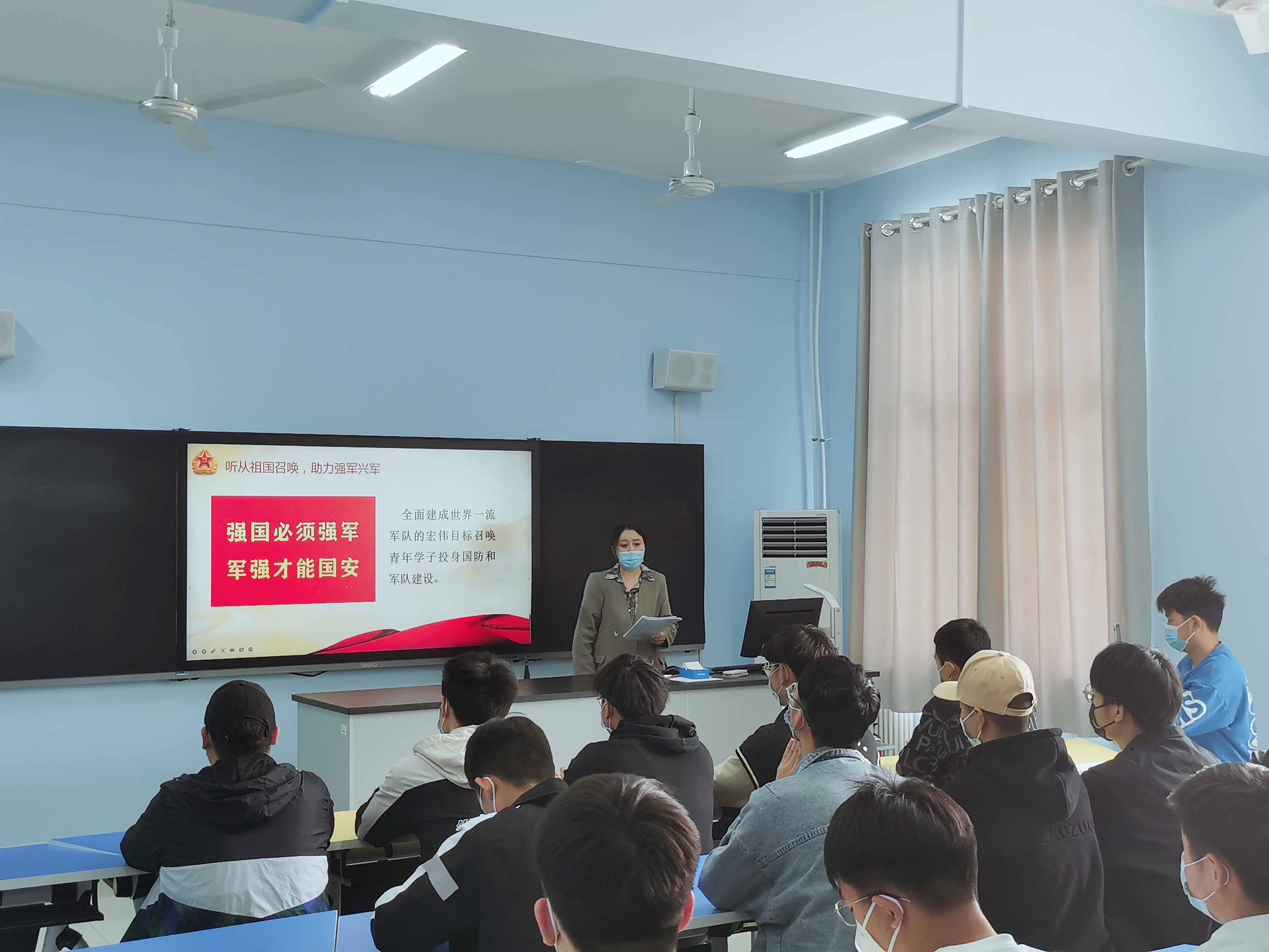 为鼓励学生响应国家号召参军入伍、投身国防建设事业,必赢242net官网于4月29日下午三点在A325教室开展线上线下相结合的征兵政策宣讲活动,男生线下参加,女生线上参加。本次活动由辅导员李琦主讲,团委副书记袁泉和辅导员李世尧出席,必赢官网18、19级全体学生参加。