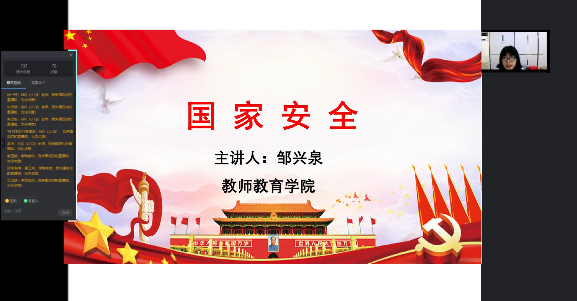邹兴泉老师在第四讲中围绕国家安全。向同学们普及国家安全知识,介绍了国家安全的相关法律等内容,引导学生全方位了解国家安全的深刻内涵及国家安全的重要意义,营造了浓厚的宣传教育氛围。接着,李书记带领大家集中学习《中华人民共和国国家安全法》等国家安全相关法律,重温国家安全知识,激发同学们的爱国热情。