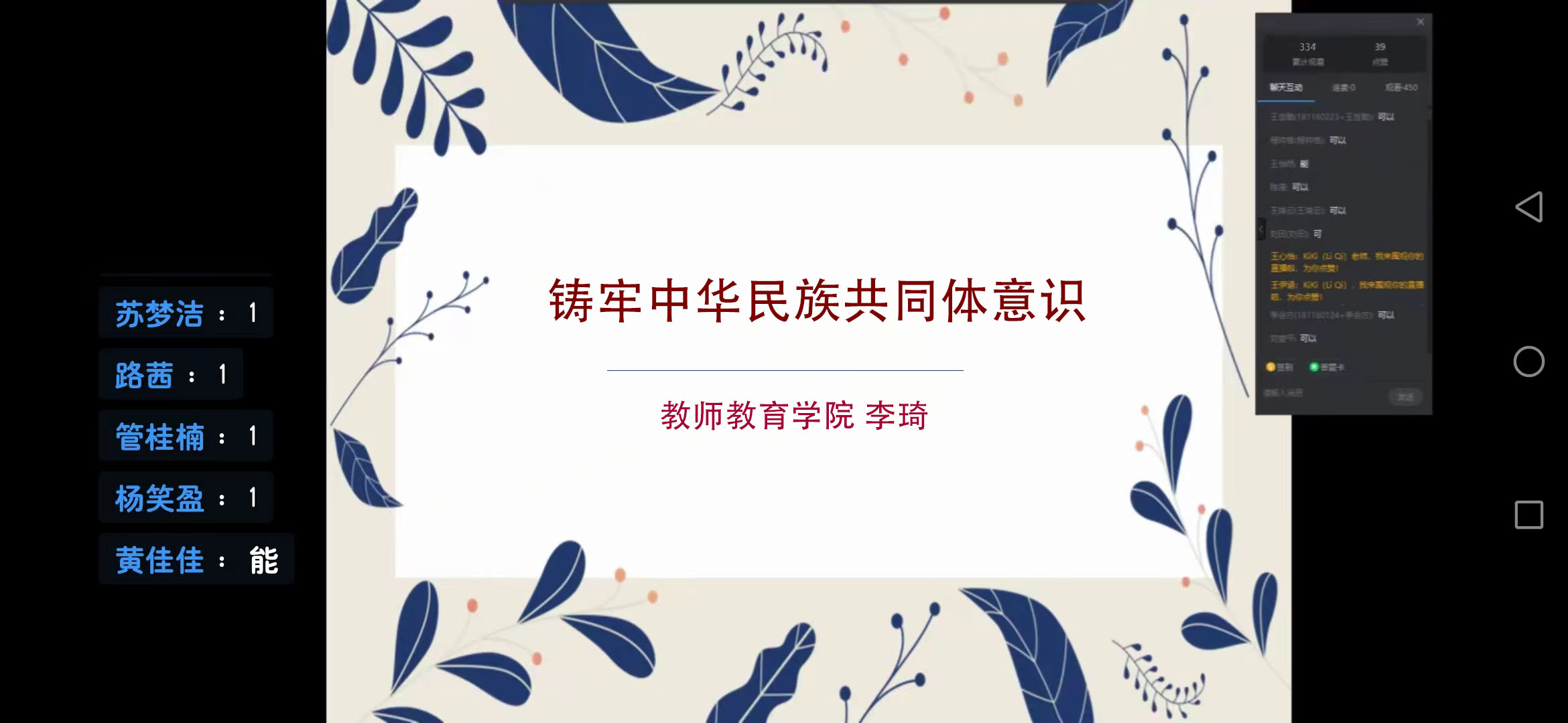 李琦老师讲到新时代的中国青年必须牢记党的教诲,始终对党忠诚,自觉把听党话、跟党走的信念内化于心、外化于行。对党忠诚,关乎党和国家事业发展的全局和未来,是堪当民族复兴重任的时代新人的政治底色。习近平总书记语重心长地指出:“青年之于党和国家而言,最值得爱护、最值得期待。实现中华民族伟大复兴的中国梦,就要以铸牢中华民族共同体意识为主线,把民族团结进步事业作为基础性事业抓紧抓好。让学生深刻认识所有发展都要赋予民族团结进步的意义。