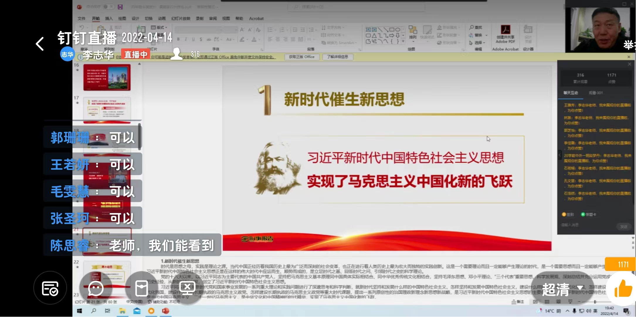 为使当代大学生在中国共产党百年华诞的重大历史时刻、继往开来的重大历史关头,更加认识到中国共产党的伟大成就,按照学校大思政方针,2022年4月14日晚19点,必赢242net官网党总支书记李志华通过钉钉直播进行本学期《形势与政策》课第一讲。