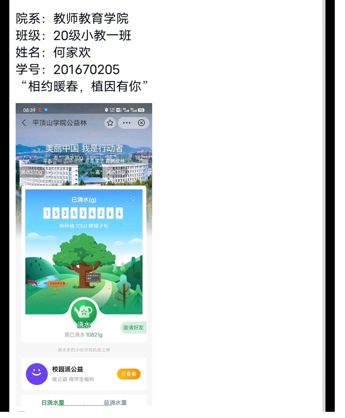 此次活动主要有两种形式。活动形式一,同学们可以充分利用现有网络便利,使用支付宝小程序蚂蚁森林,进行网络植物云浇水。活动形式二,同学们利用闲暇时间外出采风,拍摄绿色植物,记录身边的绿色,用照片留住每一片绿意。无论是哪种活动形式,同学们都积极参加,用自己累积的水滴进行植物云浇水,用一个个镜头记录身边的春意。活动也在同学们满满的热情中圆满结束。